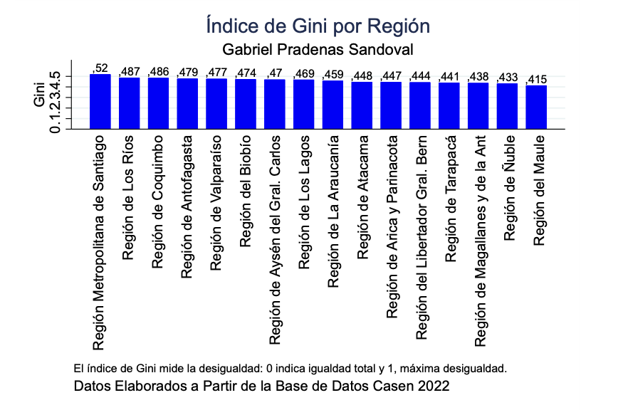 Los datos regionales del índice de Gini en Chile muestran una realidad preocupante. La Región Metropolitana lidera con un Gini superior a 0.52, seguida por Coquimbo, Antofagasta y Los Ríos.