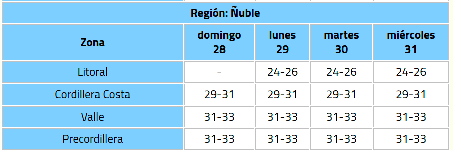 La Dirección Meteorológica de Chile (DMC) emitió un aviso meteorológico por altas temperaturas que afectará a la Región de Ñuble durante los días previos y posteriores a Año Nuevo, específicamente entre el domingo 28 y el miércoles 31 de diciembre.